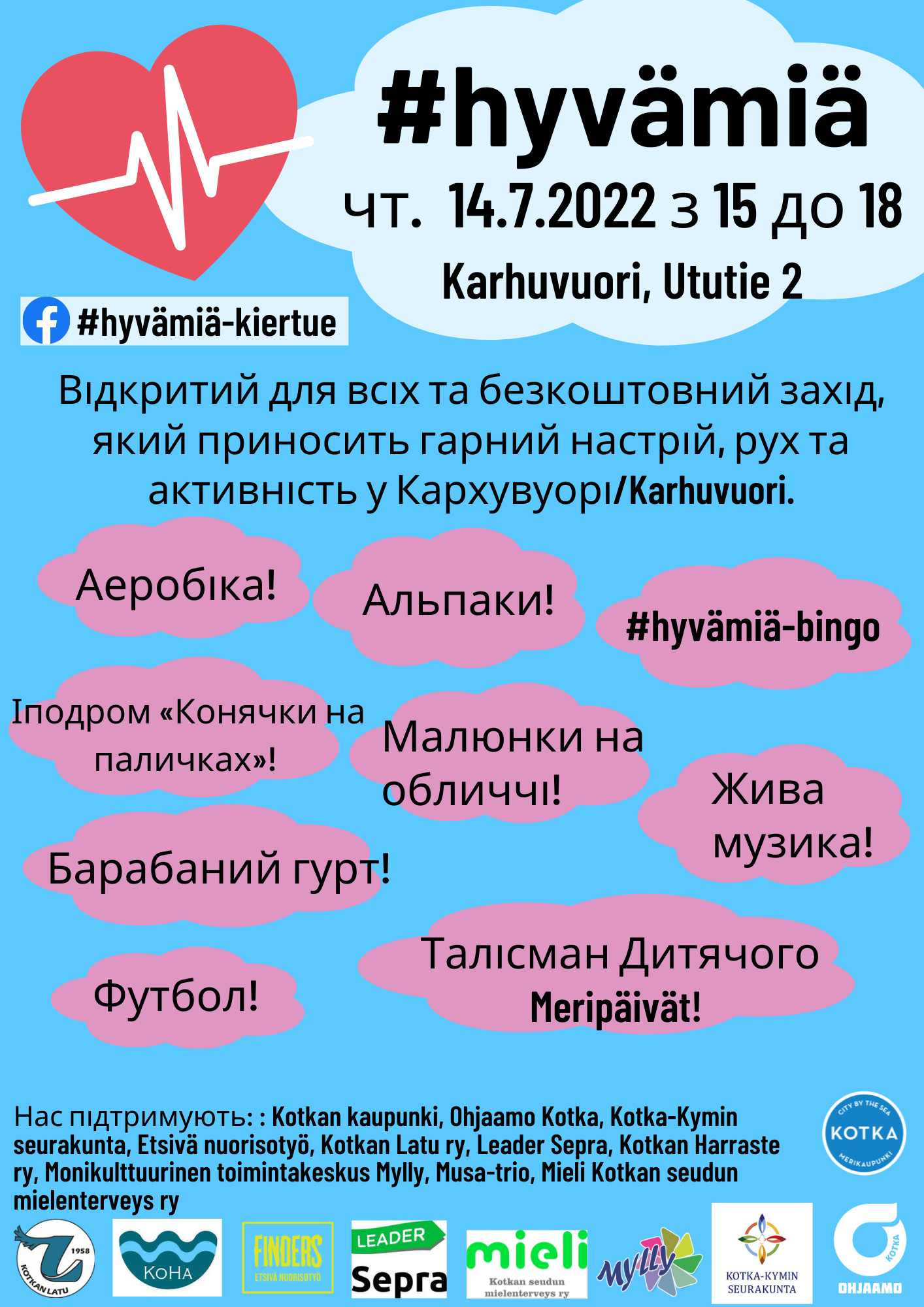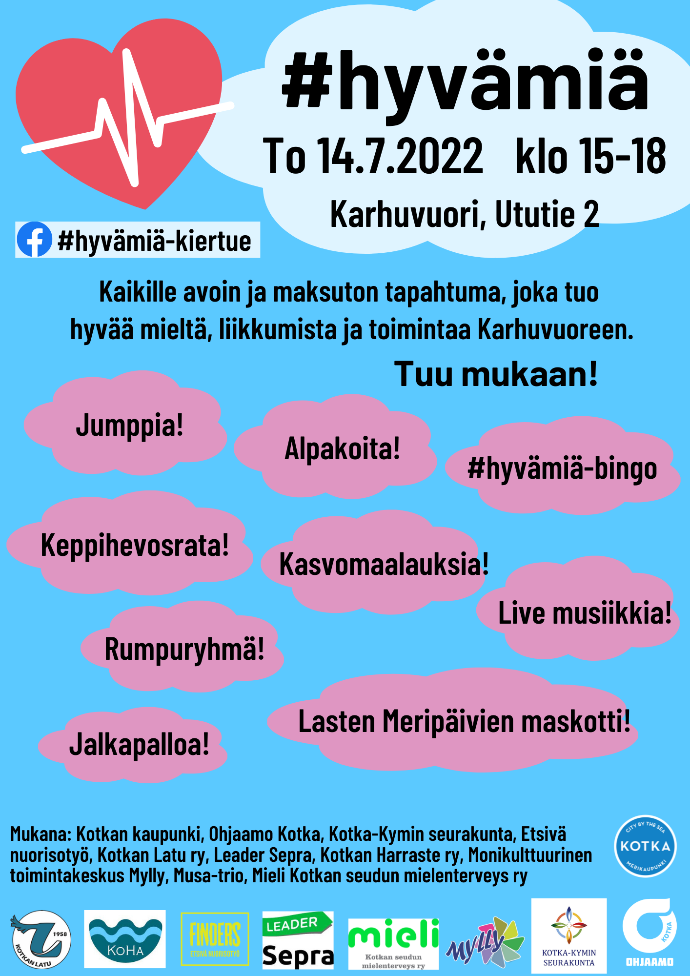 Torstaina 14.7. järjestetään Karhuvuoressa Velhon päiväkodin ja Karhuvuoren kentän ympäristössä (osoitteessa Ututie 2, 48350 Kotka) koko perheen hyvän mielen #hyvämiä -tapahtuma osana laajempaa #hyvämiä -kiertuetta. Tapahtuma on kaikille avoin ja maksuton. Ohjelmassa mm. jumppia, keppihevosrata, musiikkia ja jalkapalloa. Paikalla myös alpakoita ja Lasten Meripäivien maskotti! Lapsille saatavilla kasvomaalauksia.