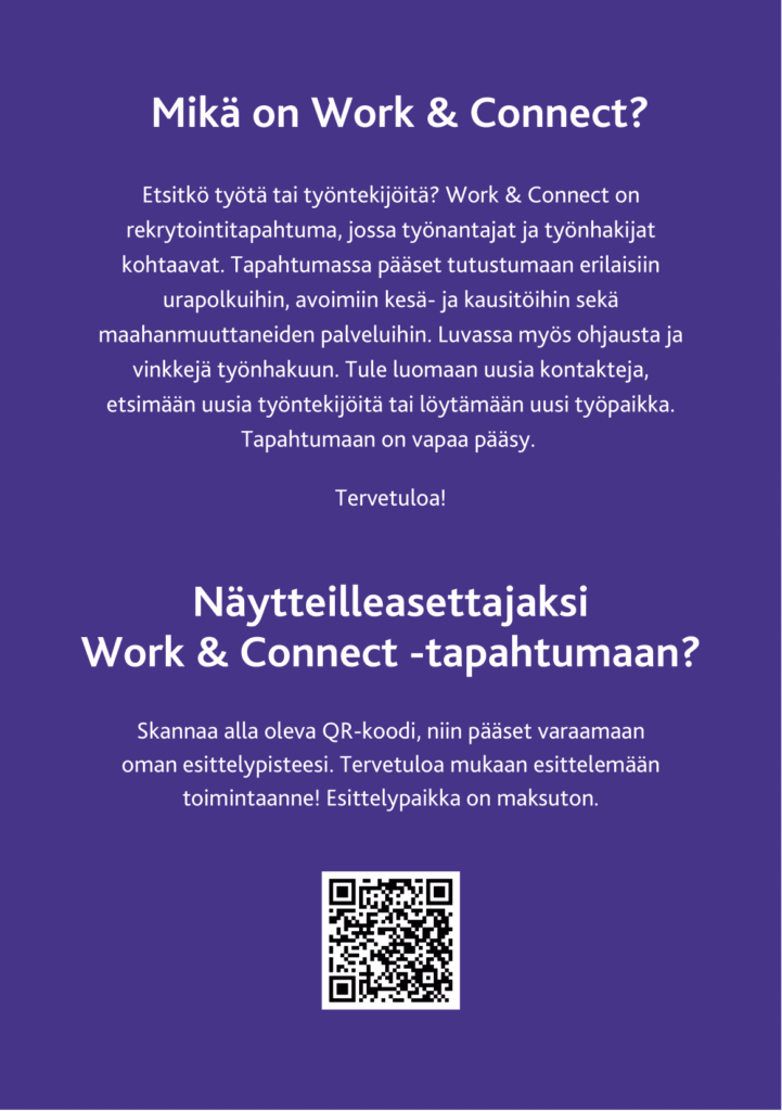 Work & Connect on tapahtuma, jossa työnantajat ja työnhakijat kohtaavat. Tapahtumassa pääsee tutustumaan erilaisiin urapolkuihin, avoimiin kesä- ja kausitöihin ja maahanmuuttaneiden palveluihin. Luvassa on myös ohjausta ja vinkkejä työnhakuun.
