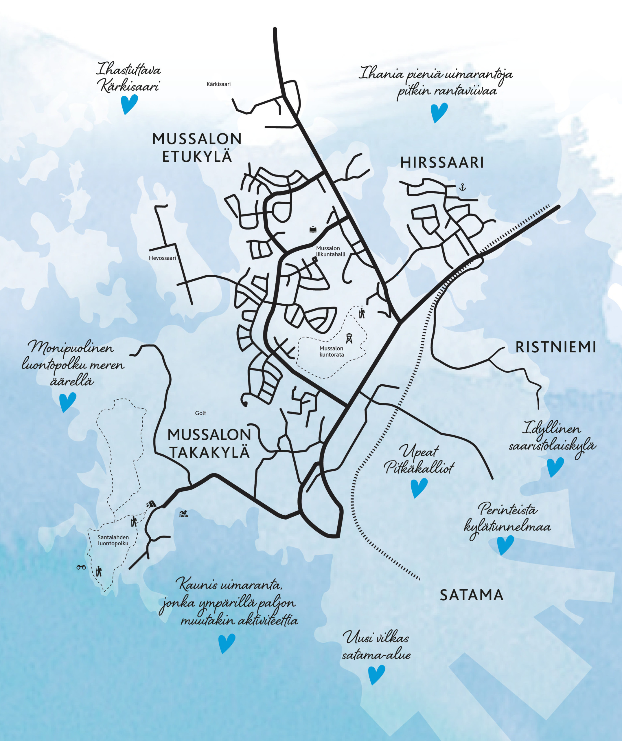 ”Täällä ollaan lasten kanssa viihdytty. Turvallisessa ja kauniissa ympäristössä. Mussalossa on ihana koulu, monta leikkikentättää, meri jokapuolella, uimarannat, lenkkipolut, jalkapallokenttä, eikä keskustaankaan ole pitkä matka. Asumme rivitalossa, joka on vuokra-asunto ihanalla takapihalla. Lähin uimapaikka on 500 metrin päässä. Kaikkea on, mitä ihminen voi toivoa.”